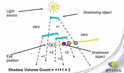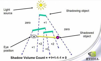 Shadow Volume同样是一种阴影映射图的阴影生成方法。但是在渲染动态光源的效率方面他有着先天的优势。其原理是先从光源向可渲染的每一个边缘引一条直线,从而在场景中形成一个个的阴影锥。然后在从视点向要被渲染的物体引一条直线,通过计算这条直线穿过阴影锥边缘的次数而得到被渲染物体是否在阴影之内的结果。这种方法由于不需要生成Shadow Map所以在处理动态光源的时候其开销相比Shadow Mapping要小的多。