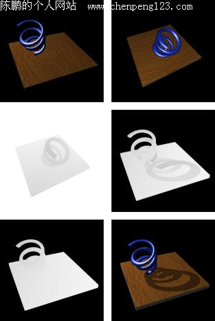 我们可以通过上面的图来了解一下Projected planar阴影的生成过程。左上图是没有阴影的正常视点渲染结果。右上图是以光源为视点的没有阴影的渲染结果。中左是以光源为视点的shadow map (depth map)。而中右是将前面的shadow map (depth map)中的物体投射(投影)放在以正常视点为基础的平面上。左下是正常视点的shadow map (depth map)。右下图是经过最后处理(通过对比前面的第四和第五张图)的带有阴影的渲染结果。但是在计算机处理的正常过程中是没有第一步和第二步的。