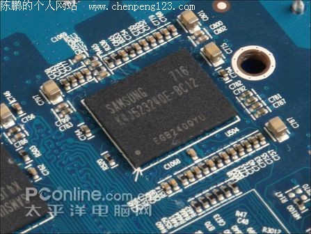 显存方面,蓝宝石 HD 2600XT Dual采用了三星1.2ns-DDR3的显存颗粒,每颗编号为“K4J52324QE-BC12”,其中“K4J”代表显存类型为GDDR3,GDDR4的编号“K4U”,其后的“52”代表单颗显存容量为512Mbit,512Mbit/8 = 64MB,即单颗容量为64MB,在三星颗粒中55、56代表了容量256Mbit,而51、52代表容量为512Mbit。其后的“32”表示单颗位宽为32bit。因此该显存的规格为16Mbit x 32bit,由于蓝宝石 HD 2600XT Dual正反面各具备了8颗显存颗粒,因此一共16颗该规格的显存总容量,根据计算公式=16MBit x 32bit x 16/8bit=1024MB可以得出。
