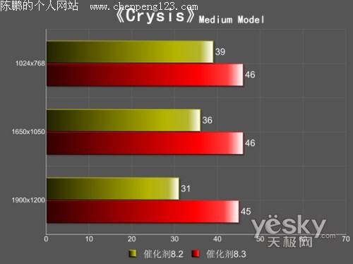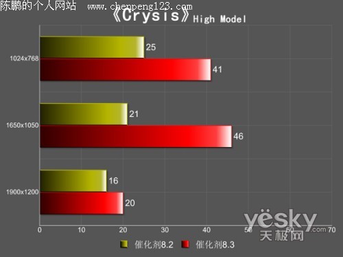 在关键的Crysis测试中,以往测试1680X1050以上分辨率的AA模式和高画质设置下HD3870 X2性能骤降明显是驱动程序对游戏的优化问题,果然在催化剂8.3下得到了明显改观,在Medium画质下,催化剂8.3下HD3870 X2性能提升8.2 15-20%左右,而在在High设置下,性能提升近50%!