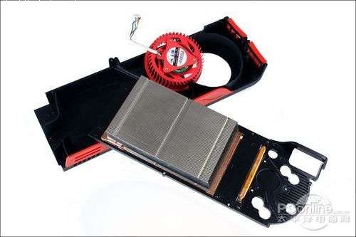 华硕HD5870采用公版的一体式涡轮散热设计,散热系统散热主体由涡轮风扇,铝质散热模块和热板组成,而且散热器的尾端有两个进风口与挡板的出风口形成风道。整个一体式散热器充分照顾到显示核心、显存和供电模块的散热需求。