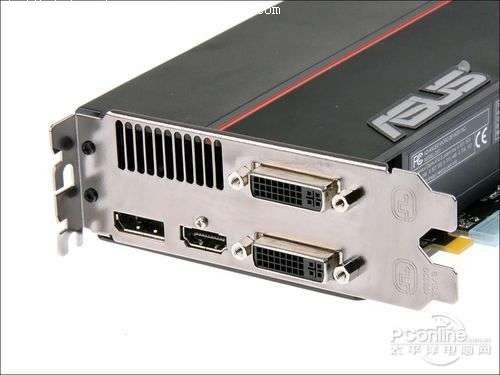 华硕HD5870输出接口提供了两组DVI,HDMI和Displayport接口各一个,DVI接口采用屏蔽方式可以减少信号受干扰的情况。由于DVI采用了并排摆放占据了半个当班位置也导致了只有半个挡板的出风口。
