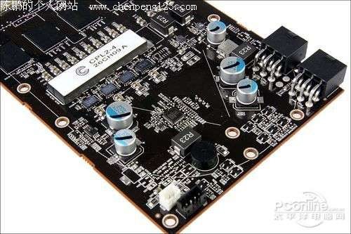 显卡供电方面采用VOLTERRA方案,核心与显存分离式4+2数字供电模式。核心供电采用一颗CPL2-4耦合电感搭配多颗VT1157SF芯片组成4相数字供电。显存供电则采用两颗封闭电感搭配Volterra VT242WF芯片组成2相数字供电。这样的供电模式为HD5870 提供稳定而纯净的显卡供电。