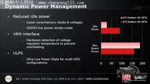 Cypress采用了新的电源管理模式,在待机时可降低核心和显存频率以及电压,使HD 5750的待机功耗比HD 4870大幅度降低,可以说新的实时电源管理表现相当出色。