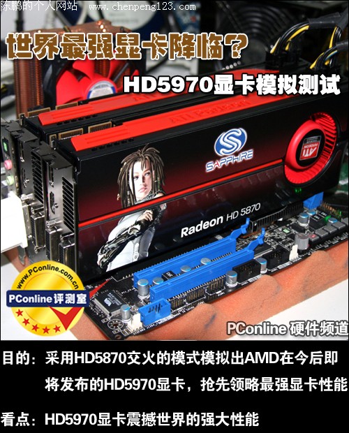 如今HD5970显卡还并没有正式发布上市,但不可否认它的存在以及它为众多网友所关注的性能。出于种种原因,我们现在还无法拿到HD5970的样卡,但是我们和网友一样对这款显卡的性能充满了期待和好奇,待HD5970发布时是否会成为世界最强显卡呢?今天我们就通过两张HD5870组建交火的模式来模拟出HD5970显卡的性能,抢先尝试它的强大性能,下面我们就正式开始今天的见证世界最强显卡之旅。