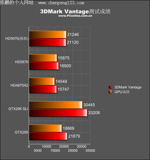 在3DMark Vantage理论性能测试中HD5970显卡的总分和GPU成绩都超过了两万分,并且以大幅优势领先GTX295和目前顶级的HD5870显卡,不过与拥有4颗核心的GTX295 SLI比较HD5970还是落后于对方。当然,出现这种情况的原因和显卡物理加速不无关系。