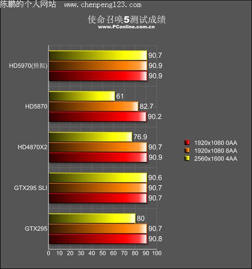 《使命召唤5》中HD5970与GTX295 SLI在我们所测试的三个分辨率中基本上都处于满帧的状态,其它两款显卡则在2560X1600分辨率下各有高低。