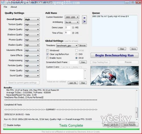 测试设置:DX10游戏模式下将各项画质的设置都为high,开启4XAA抗锯齿,测试1680X1050分辨率下的游戏性能。