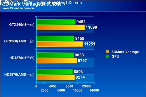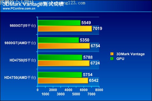 通过上面的测试成绩我们不难发现同一张显卡在Intel I5平台下的3DMark Vantage理论性能成绩要比在AMD Phenom II X4 955平台下的成绩略高,出现这种情况其实不难理解,这里主要是因为I5 750处理器的性能要高于AMD Phenom II X4 955。需要着重说明的一点是,9800GT和GTX260在I5平台下的3DMark Vantage总分要高于HD4750和HD4870,而他们并没有因为更换到AMD平台后在成绩上落后于对方,这一点很好的说明了平台对所有显卡性能的提升是一致的,而并非AMD平台对AMD显卡有特别或者特殊的提升。