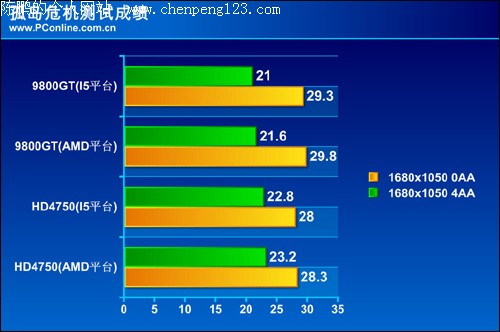 如果说由于CPU的原因造成在3DMark Vantage理论性能中I5平台下的显卡成绩要略为优秀的话,那么在游戏《孤岛危机》的测试部分中我们能非常明显地看出这四张显卡无论是在AMD平台下还是Intel平台下的游戏帧数都非常接近,因为平台改变而带来的性能提升几乎看不出来。