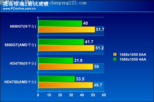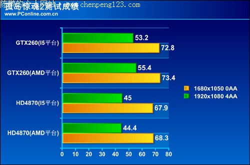 看完了《孤岛危机》的测试成绩,接着我们再看到《孤岛惊魂2》的游戏帧数,从上面的测试成绩列表不难看出在I5平台下处于领先优势的9800GT和GTX260并没有因为更换到AMD平台而在性能上落后对手;而对比两个平台下的游戏帧数基本没有明显变化。