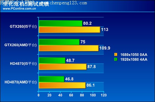 游戏《生化危机5》对CPU的高要求是众所周知的,因此在这款游戏的测试结果中我们看到在性能更高端的I5平台下所测试的四张卡的成绩均要比在AMD平台下的成绩要高。