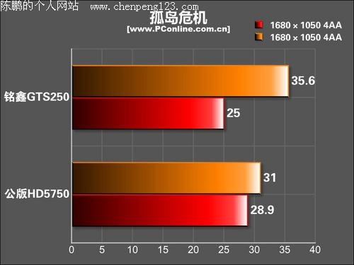 《孤岛危机》游戏测试分辨率为1680×1050,其真实的3D渲染带来的高荷载能给与显卡架构与显存有很大考验。两块显卡仅在0AA抗锯齿的画质下保持基本流畅,此时铭鑫 GTS250U-1GBD3TC 中国玩家版取得领先,但到4AA高画质环境下,铭鑫 GTS250U-1GBD3TC 中国玩家版有所落后。