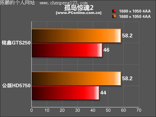 《孤岛惊魂2》测试更多地反映了GTS250的256bit显存位宽与HD5750 128bit显存位宽的差距,反而显存对分辨率的影响不如前者明显。铭鑫 GTS250U-1GBD3TC 中国玩家版虽然在0AA下雨HD5750持平,但是在考验显卡显存带宽与核心频率的4AA测试中铭鑫 GTS250U-1GBD3TC 中国玩家版取得了领先。