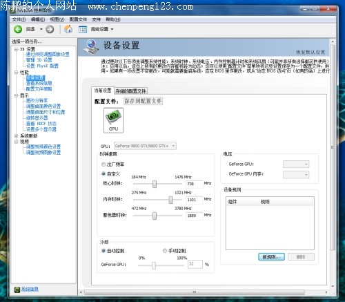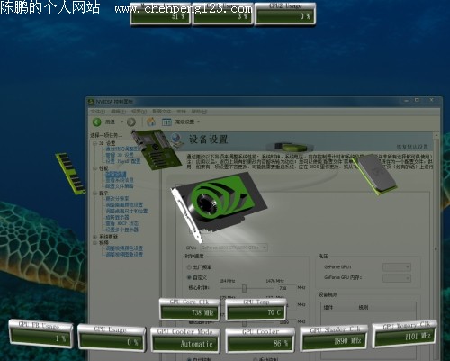 不过NVIDIA官方超频功能还是比较全面的,支持频率调节、风扇调节、电压调节以及自定义策略等。硬件监控为一个独立的程序NVIDIA System Monitor,可以监控包括显卡在内的5大件状态,不过唯一不足就是无法查看硬件的历史状态。