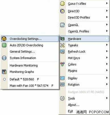 与针对于NVIDIA显卡的Rivatuner相对应,ATI Tray Tools是一款由俄罗斯人开发的专门为AMD而打造的显卡优化和超频工具,这款超频软件的功能也同样相当强大。打开这款软件会在系统托盘显示一个AMD图标,点开之后可以对显卡的各项设置进行调节,其中主要包括超频选项、AA/AF画质调节、分辨率调节以及显卡监控等。