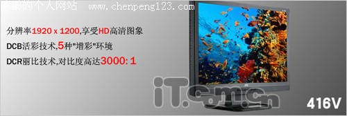 416V具备1920 x 1200的高分辨率,DCB(Dynamic Color Boost) 活彩技术和 DCR( Dynamic Contrast Ratio) 丽比技术 , 具备3000:1超高动态对比度,DCB赋予了416V5种色彩增强模式,配合Eco mode-5 段亮度调节,预设5种亮度模式,优异人性化的功能从AOC 210V得到了继承。