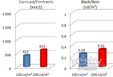 除了色彩还原力以外,现在越来越多的消费者开始关注黑色深度。这里我们测试了200 cd/m2和100 cd/m2下的对比度