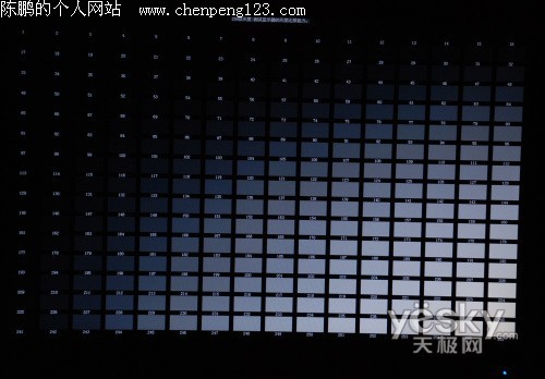 此处通过对灰度/色阶方面的测试,了解液晶显示器灰阶过度能力,黑色至白色的表现力度等。在测试中我们所看到的黑白或者彩色的过度部分,其表现的差异越大,则显示器的输出能力越强。