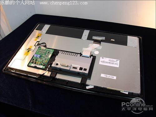 撬开后盖后我们便看到了显示器的内部结构,首先映入眼帘的便是驱动电路和液晶面板。让笔者十分赞叹的是三星高超的工艺设计,开后盖没有看到一颗螺丝。