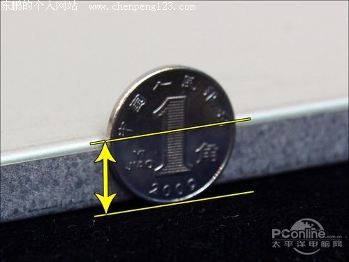 面板厚度控制得十分到位,从上图对比1角硬币的厚度可以看出,三星 XL2370的面板厚度大约不到一公分。