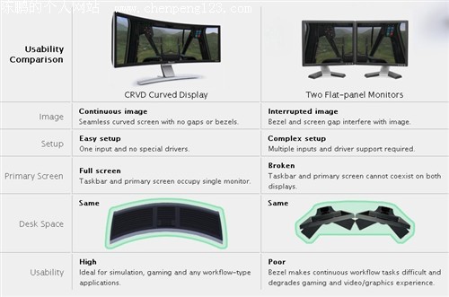 CRVD曲面显示器显示可产生图像连续图像,不会像双屏拼接一样具有黑边细缝影响视觉效果;安装也相对简单,没有复杂的驱动程序设置;在全屏幕显示时,任务栏和主屏幕可以同时占据单显示器,而双屏拼接则不能共存;由于没有了多屏拼接的黑边,增强了真实的画面感受。