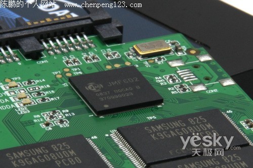 在控制单元(或者称为主控芯片)部分,我们可以看到这款产品采用了智微科技的JMF602 SSD芯片,这款芯片能够提供理论最高达到170M/S的读取速度和140M/S写入速度,是JMF601 SSD芯片的升级版,同时也是固态存储设备中比较常用一款控制芯片,在稳定性与兼容性方面的表现已经过不同领域的测试,是一款相当值得信赖的主控芯片产品。