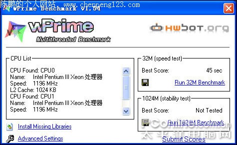 由下面的截图可以看到,wPrime V1.54暂时还无法正确识别这款Intel Core2 Duo(Penryn) T4200(2.0G)处理器,不过测试依旧可以运行。双核同时运算32M测试时间为45.000s(时间越短性能越高)。