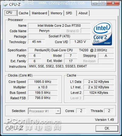首先,我们先来看看这款定位最低端的45纳米双核处理器:Intel Core2 Duo(Penryn) T4200(2.0G)。