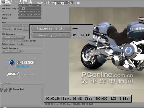 同样的,由于wPrime软件的兼容性问题,我们也无法得到这款处理器的成绩,但是CINEBANCH R10依旧很好的运行着,得到了这款Intel Core2 Duo(Penryn) P7450(2.13G)处理器的成绩是4273分,虽然分数上比主频仅为2.1GHz的T6570处理器还要低,但是笔者之前已经提醒,由于我们并不是在同一平台下对处理器测试,因此此成绩只能作为一个大概性的参考,没有任何可对比性。