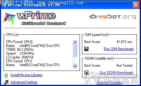 为了体现45纳米处理器究竟为我们带来了什么,笔者将一款65纳米工艺生产的,拥有2.2GHz主频的Intel Core2 Duo(Merom) T5900处理器的成绩也带上了。可以看到2.2GHz主频的T5900在wPrime的成绩还不能进入40s内,成绩比T6570(2.1GHz)要低不少。