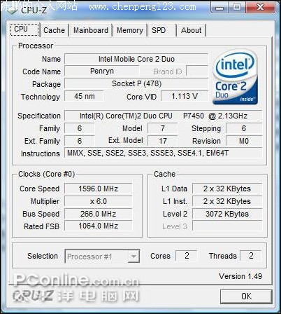 之前,英特尔发布“迅驰2”的时候,推出了一款“最低端”的双核处理器产品:Intel Core2 Duo(Penryn) P7350(2.0G),采用了45纳米工艺的Penryn核心,1066MHz的前端总线,3MB的二级缓存,而是也是首款TDP功耗降低到25W的处理器(T系列处理器的TDP功耗均为35W)。但是推出以来,P7000系列处理器并没有出现过多的更新,只是在近期出现了支持VT虚拟化技术的P7370(2.0GHz)以及今天的主角:Intel Core2 Duo(Penryn) P7450(2.13G)。