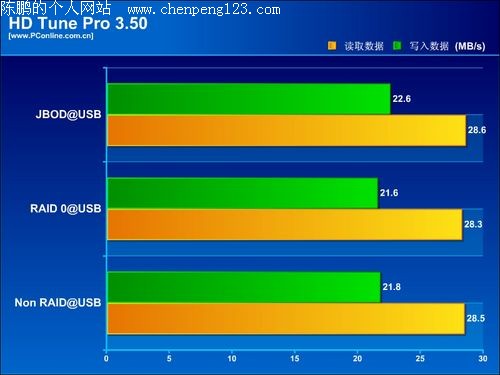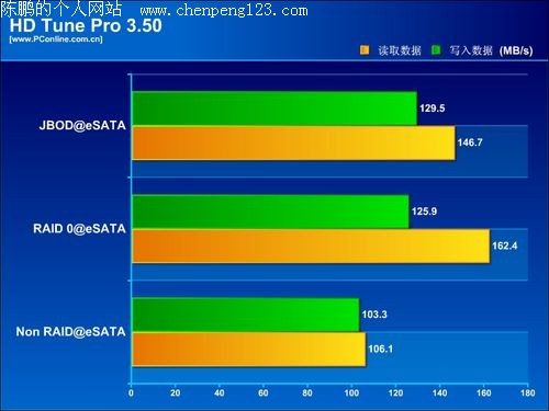 小结:存储巴士A380外置硬盘盒在使用eSATA模式下不论是在非阵列还是在组成阵列时传输速度上都体现了非常高的传输速度,特别在RAID 0阵列下传输读写速度更高达140.5MB/s和118.6MB/s。但在USB模式下由于接口速度上的局限,使到传输速度有所折扣,与eSATA的传输速度形成了鲜明的对比。