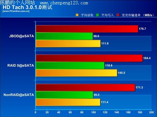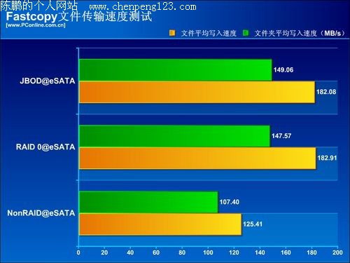 考虑到这次测试的对象存储巴士A380外置硬盘盒提供了eSATA及USB两种接口方式,并且还能对进行组建阵列。我们选择了其中的三种阵列模式(Non Raid、Raid 0、Raid JB0D)下测试eSATA及USB的传输速度。使用HD Tach和HD Tune进行读写速度上的测试,使用Fastcopy进行复制文件及文件夹速度的测试。由于USB接口在最高速度上有所限制,这次测试我们关注的主要是eSATA接口的速度,在HD Tune测试中会加入USB接口的速度进行对比。