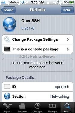 第2步:安装OpenSSH。可以在Open Cydia中搜索OpenSSH,然后即可下载并安装这款程序,之后重启iPhone。