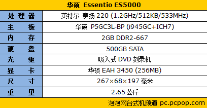 在这个性能似乎有些过剩的时代,对多数用户来说,适用的才是最好的。根据产品的定位,Essentio ES5000的配置非常有针对性:集成在主板上的英特尔赛扬单核220处理器,Conroe-L核心,65nm制程,配合2GB DDR2内存和500GB SATA硬盘满足基本的日常需求不成问题。为了流畅地播放高清影片,一块支持全程硬解码的显卡必不可少,因此Essentio ES5000搭载了华硕自家出品的Radeon HD 3450显卡,可以完美地硬解H.264和VC-1编码的高清影片。