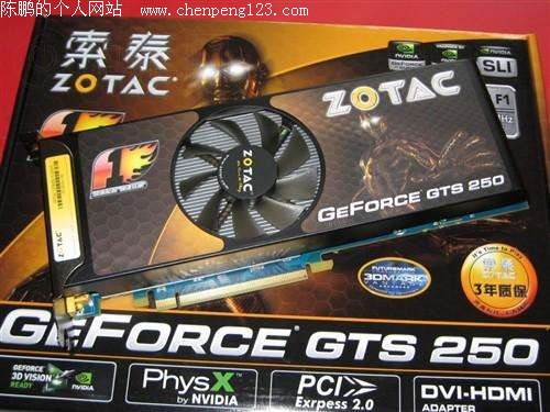 索泰GTS250-512D3 F1基于55nm制造工艺,采用NVIDIA的G92-421-B1图形核心,内建128个流处理器,支持DirectX10和CUDA运算技术,整合PhysX物理引擎,支持PhysX物理加速。板载8颗Hynix 0.8nsGDDR3显存颗粒,组成了512MB/256Bit的显存规格,显卡默认核心/显存频率为738/2200MHz。