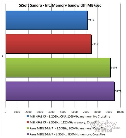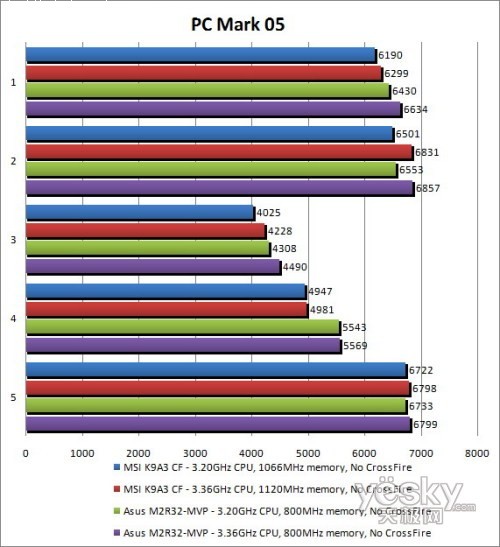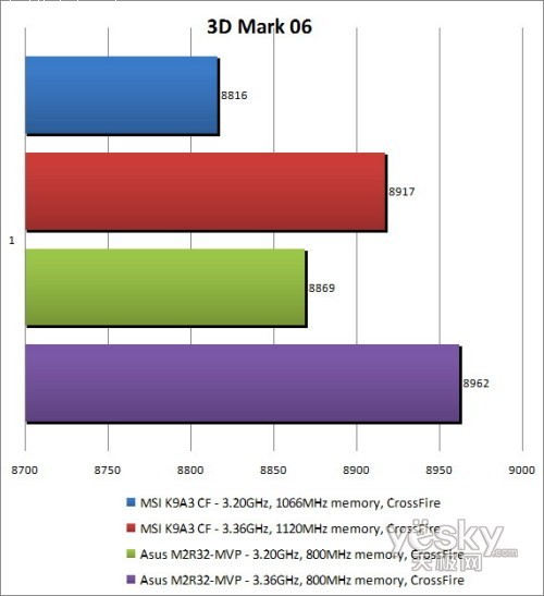 在接下来的SiSoft Sandra内存带宽测试中,微星K9A3 CF的成绩仍然落后于华硕M2R32-MVP。最后的3DMark06图形处理测试,两块主板使用的是同样的显卡,但是微星K9A3 CF再次落败。究其根源最大的因素还是CPU,第一种可能是由于AMD最新的7系列芯片组并不能完美向下兼容AM2处理器,第二种可能是因为微星K9A3 CF使用的是测试版BIOS的原因。希望Phenom处理器会让7系列芯片组的性能出现质的飞跃,但是照目前的情况来看现有AM2处理器的用户最好不要急于升级到基于7系列芯片组的主板。