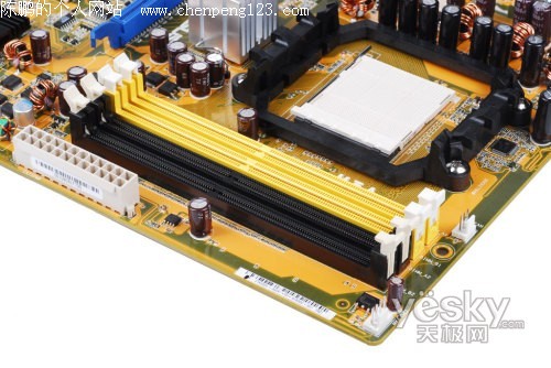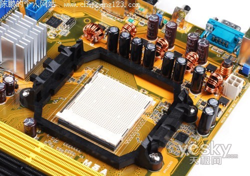 ASUS M3A采用的是AMD 770 + SB600的南北桥搭配,黄色的PCB设计具有很明显的华硕风格。由于AMD 770芯片组主要针对中低端用户,而中低端用户一般情况下不会去购买高阶处理器和高频率的内存,因此ASUS M3A的整体用料以满足中低端用户的实际需求为原则,不过仍然全部采用的是全日系电容来进行供电,个别重要的位置甚至还采用了固态铝壳电容。