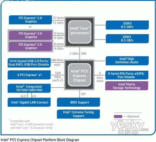 P55芯片组与处理器之间通过DMI总线进行链接,它提供了额外的6个PCI-E(1.0) X1通道、14个USB2.0接口、HD Audio及千兆LAN功能、还有6个SATA接口。