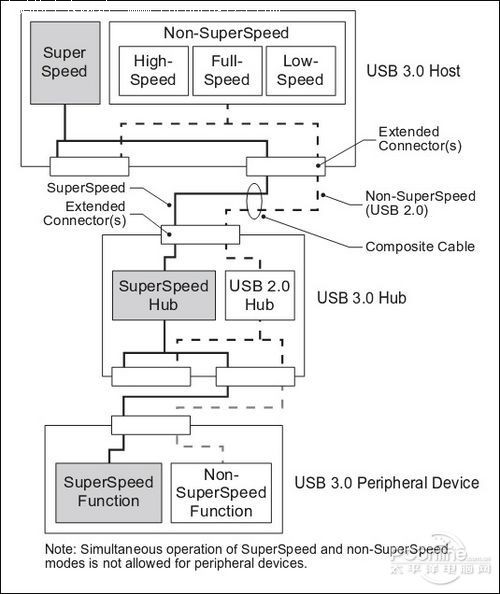 USB 3.0是最新的USB规范,由Intel等大公司发起。为了实现快速的传输速度,USB 3.0采用的是对偶单纯形四线制差分信号线,支持双向并发数据流传输,而USB 2.0基于半双工二线制总线,只能提供单向数据流传输。此外,USB 3.0还加入了新的电源管理机制,支持待机、休眠和暂停等状态。理论传输速度最大可达625MB/s。经过测试,实际速率为100MB/s左右。