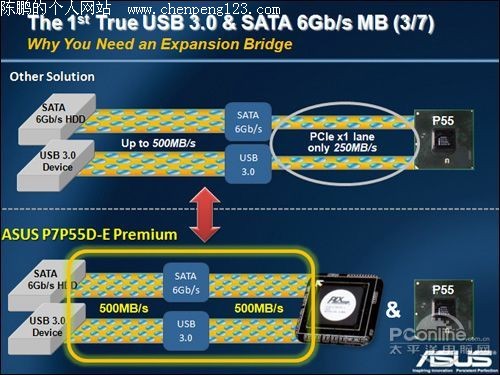 华硕 P7P55D-E Premium主板提供了expansion bridge chip,根据官方的宣传,这个芯片直接与SATA和USB设备进行总线传输而不需像普通主板经过PCIe x1的通道才能传输到主板芯片组中,保证了完整的500MB/s的带宽,实现了真正USB3.0的传输而后者受制于PCIe x1通道最终只能提供一半的带宽。