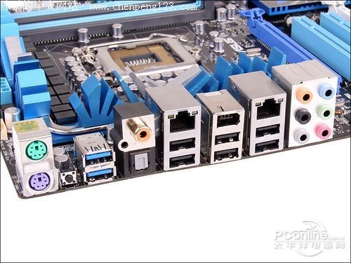 华硕 P7P55D-E Premium主板在I/O接口部分提供了PS/2键盘、鼠标接口,还有双网卡接口以及1394接口,比较特别的,就是蓝色的USB3.0接口,可以提供高达4.5Gb/s的数据传输速度。