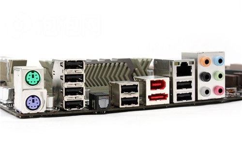 背板的扩展接口也很丰富,包括一组PS/2键鼠接口,8个USB接口,1个S/PDIF接口,1个IEEE1394和1个eSATA接口,网卡接口及音频接口。