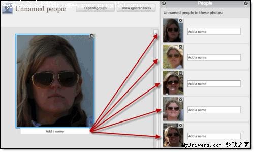 该功能相当类似于苹果iPhoto '09中的“Faces”功能,甚至实现形式也十分接近。首次打开Picasa 3.5后,软件就会搜索照片库,找出其中包含类似人脸的照片归为一个相册,用户将此人姓名输入后该相册即归为一个“姓名标签”。