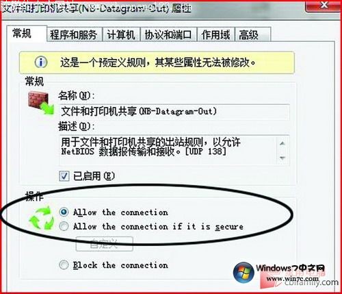 在关闭了Windows防火墙后,下一步要进入到防火墙设置界面左边的“高级设置”中,对“入站规则”和“出站规则”进行修改。在这两个规则中,分别找到“文件和打印机共享”选项,并且将其全部选项设定成“Allow all connection”。