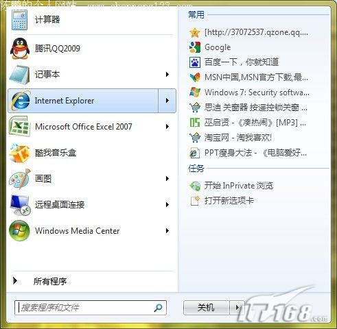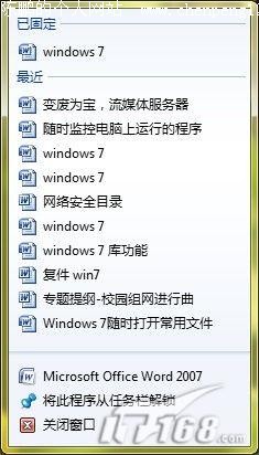 此外,为了方便用户打开经常使用的文件,在开始菜单中也增强了“跳跃列表”功能,在以前版本的Windows中,系统将最近打开的文件都集中在一个文件夹列表中,通过二级菜单的方式快速启动最近打开的文件。在Windows 7该功能溶于各个程序中,在最近运行的程序列表中打开最近常用的文件,非常方便。操作时,单击“开始”按钮,在右侧的“最近启动的程序”列表中,在此显示了打开的程序(如图7),将鼠标移动到某个程序后,在右侧即可显示使用该程序最近打开的文档内容。单击某个文档即可快速打开。