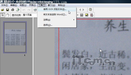 接下来双击打开前面保存的MDI文档,可以看见图片显示在左侧栏中,在右侧栏用鼠标把要进行识别的文字用红色线框起来,选好后点击菜单“工具-使用OCR识别文本”,这时软件就会对所选区域进行文字识别了(如图3)。