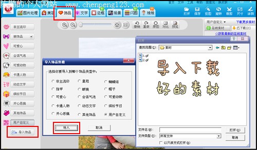 3.打开“饰品”→“用户自定义”,将导入好的素材放进图片中,并调整位置。小编这里使用的是圆形边角素材,可以把边角变成圆滑的哦!