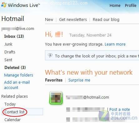以Web方式登录Hotmail邮箱,然后点击在邮箱页面左侧的“Contact list”(如图1)。